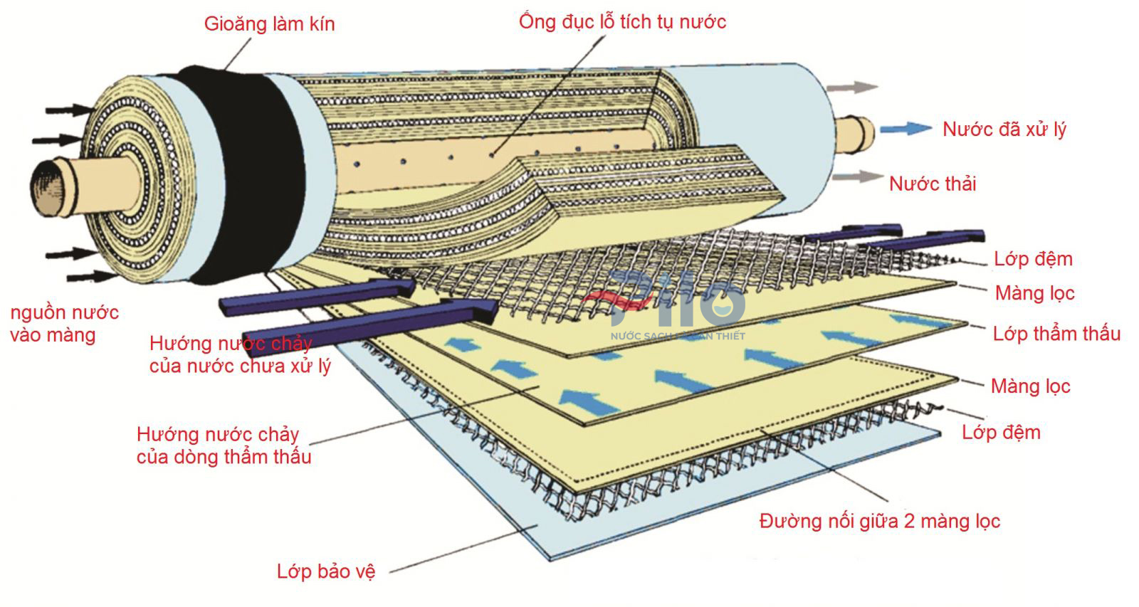 Màng lọc này được làm từ các tấm màng mỏng bằng chất liệu Thin Film Composite (TFC). Những tấm màng này cuộn vào nhau thành một lõi có hình xoắn ốc. Trên bề mặt của màng có nhiều lỗ nhỏ li ti có kích thước từ 0.1 – 0.5 nanomet, chỉ cho phép các phân tử nước đi qua và giữ lại các chất lơ lửng, tạp chất có hại hòa tan trong nước như: ion kim loại nặng, chất rắn, vi khuẩn, virus, vi sinh vật khác, hóa chất v.v